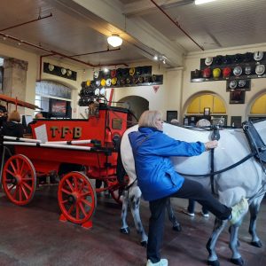 As per usual on our Probus outings, the raucous calls of those already in the rear carriage of the train greeted each and every one of us alighting at the different stations. And as per usual, our mother hen was cheerfully rallying the troops and organising our first challenge – changing trains at Richmond. Having successfully kept the crew together, we charged forward to the Fire Services Museum where we were greeted by every woman’s dream – a fireman in uniform.