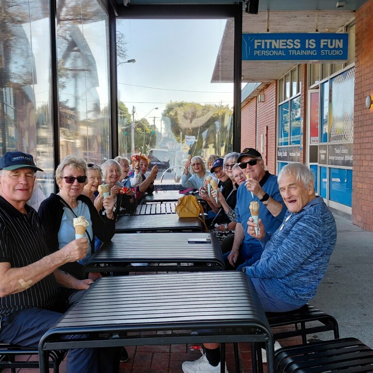 At 6.30 on the first Monday night in February the walking group went on the annual Twilight Gelati walk. Meeting in front of the Shirley Burke Theatre in Parker’s Road Parkdale we proceeded to walk down hill to Beach Road, along to Herbert Street and then up hill to Como Parade and our final destination of Bocco’s Gelato. Lots of chat along the way, as our walkers who may have been slow up Herbert St but then picked up the pace to Bocco’s where there was the challenge of deciding what flavoured and size of ice-cream to have. There were some different flavours including backlava (which I had and was yummy), passionfruit and raffaello just to name a few. It was pleasing to have a few members who were unable to walk join us for ice cream and chat. This was the last walk organised by Ken, who was unable to walk as he was still in hospital recovering from his surgery. We all thank him and Liz for all the effort they put into making our walks interesting and hope they will be able to join us on some future walks.